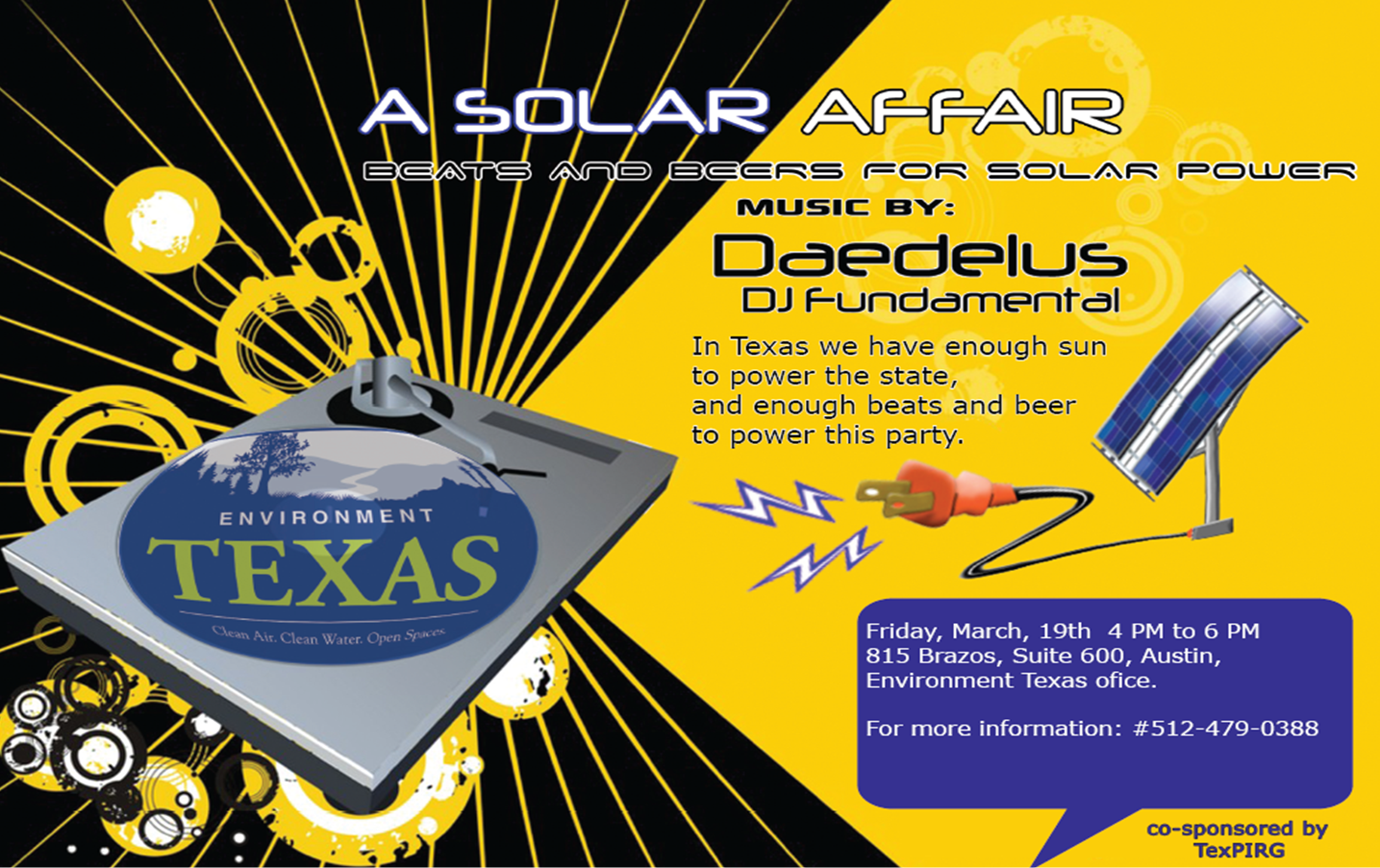 Environment Texas is throwing a SXSW party tomorrow called: A Solar Affair: Beats and Beers for Solar Power.